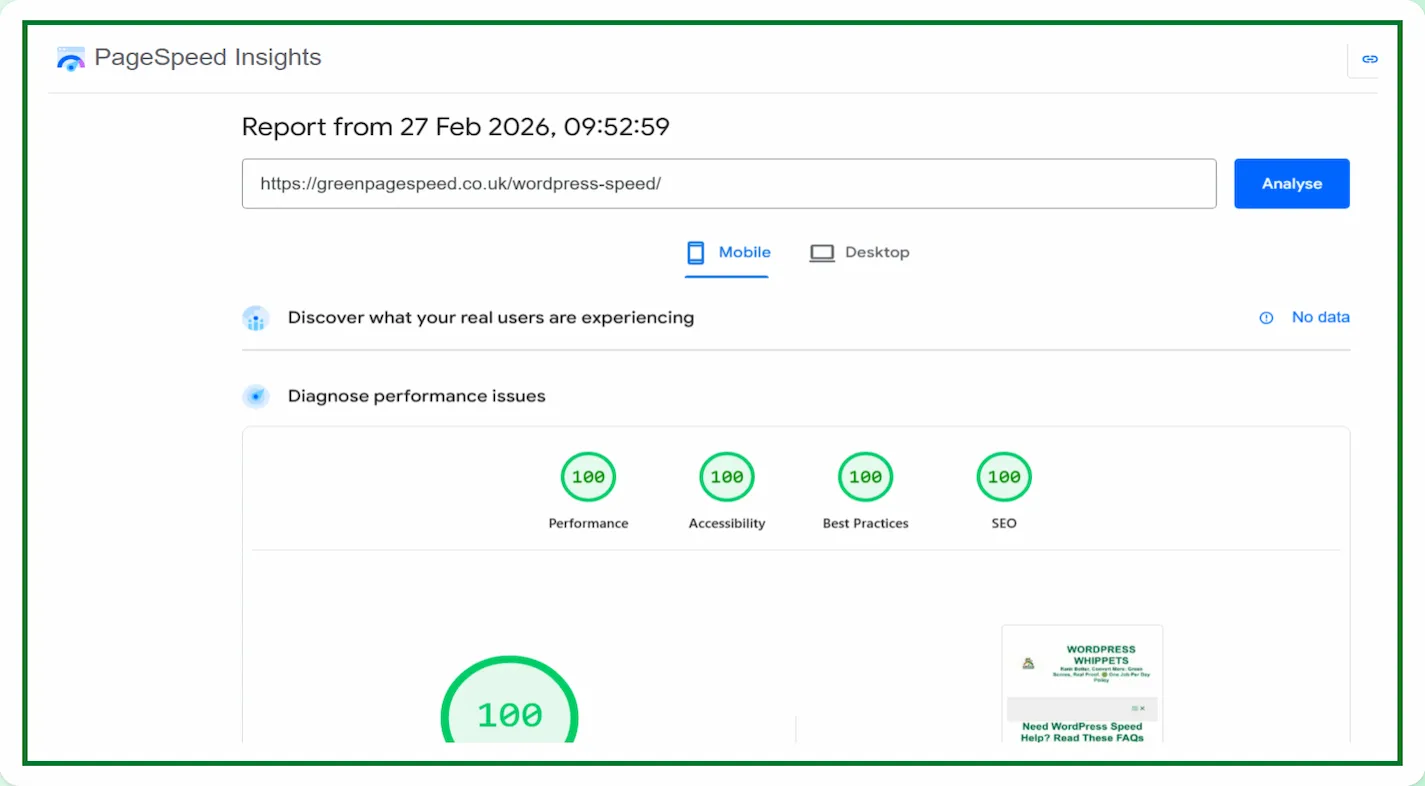29/12/25 Google PageSpeed Insights proof. Mobile test showing all green scores, real results delivered by Green PageSpeed.