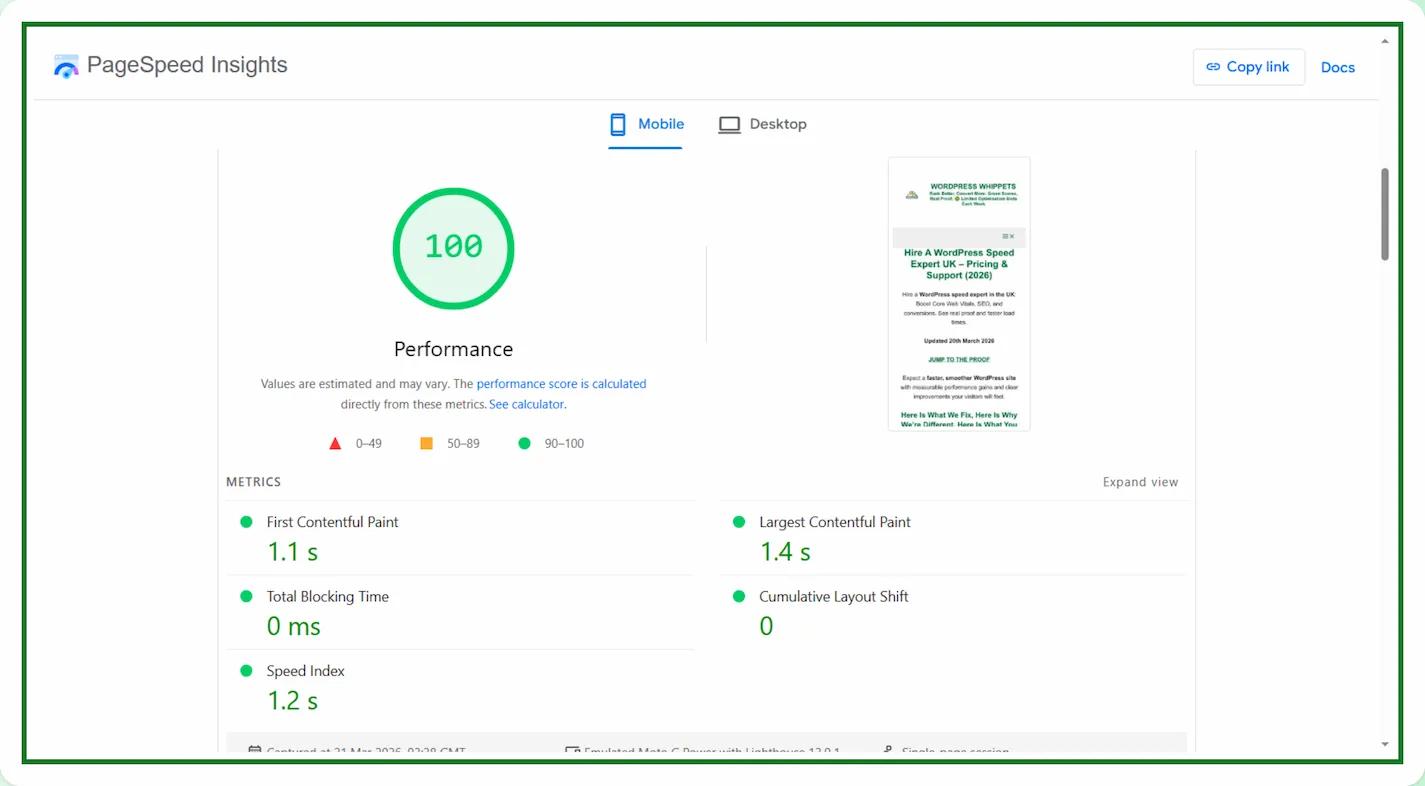 17/04/26 PageSpeed Insights result showing consistent 100/100 scores across all categories on mobile for our PageSpeed Insights page