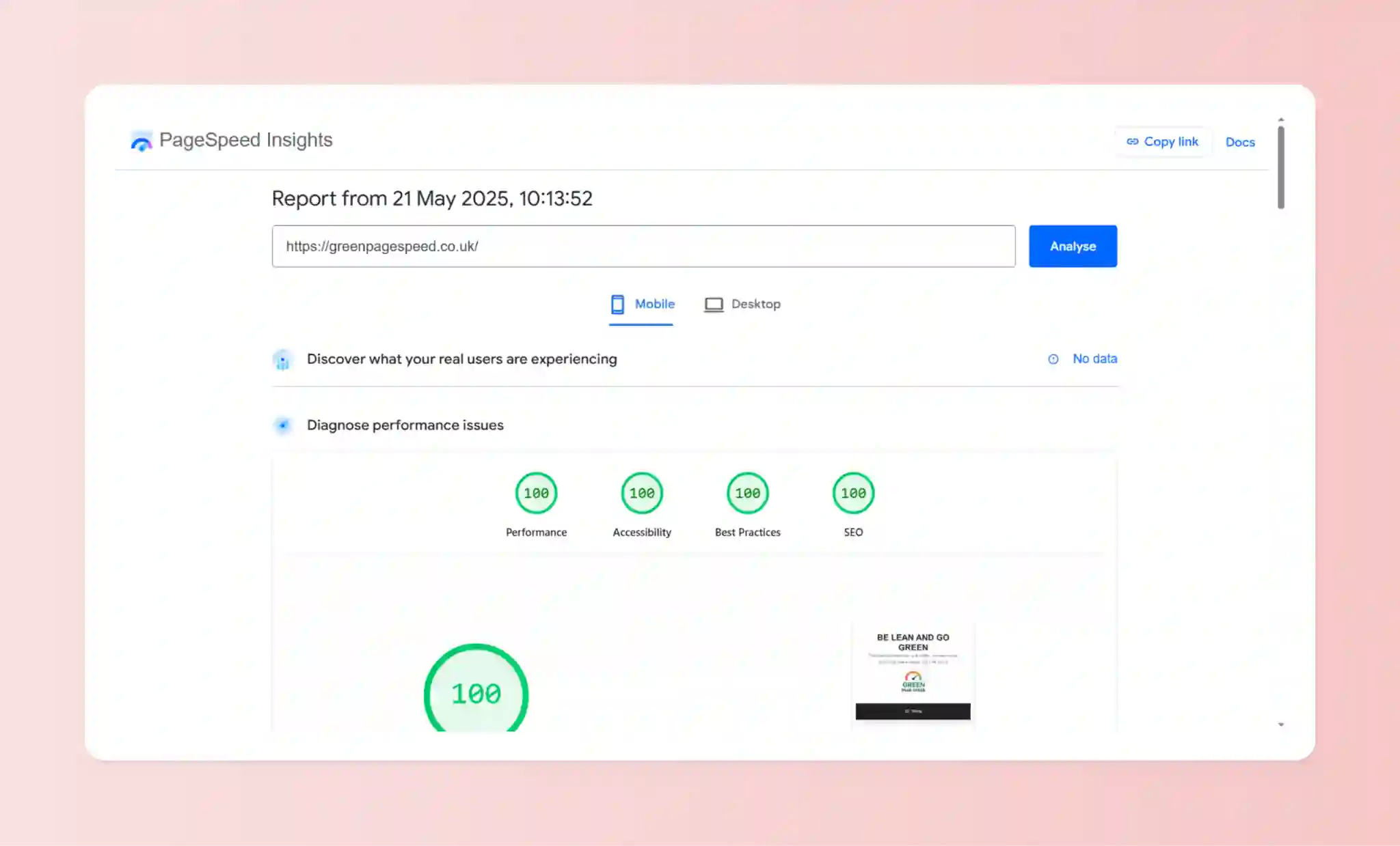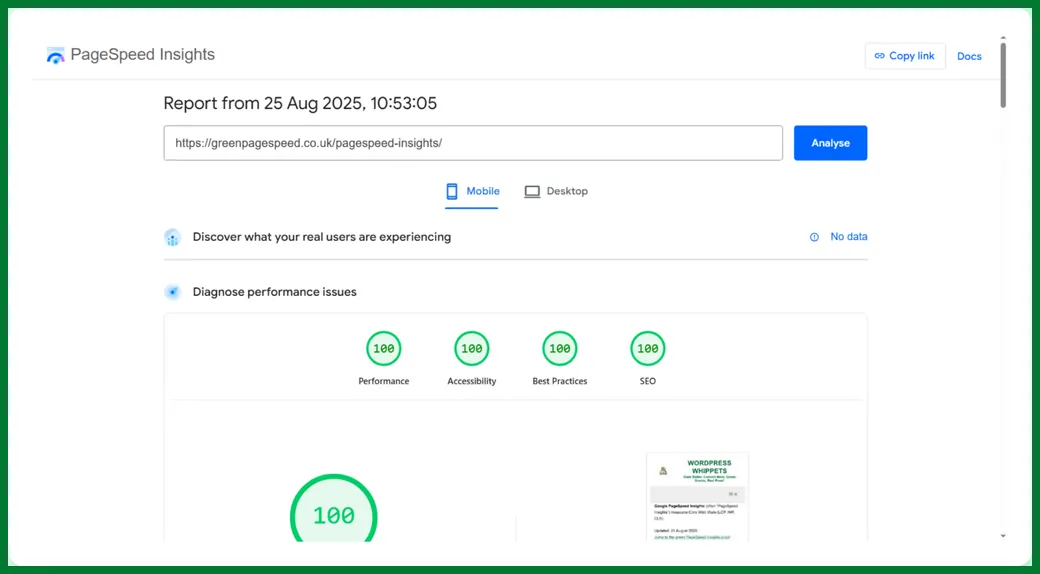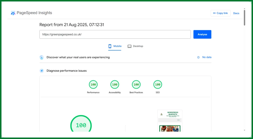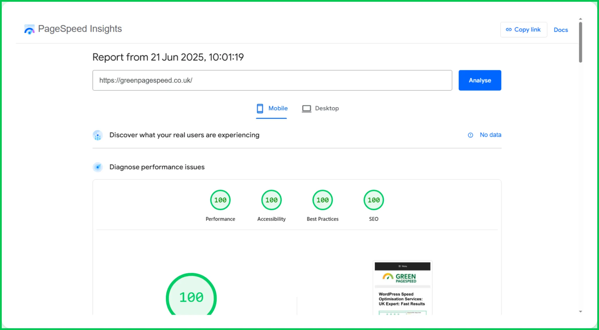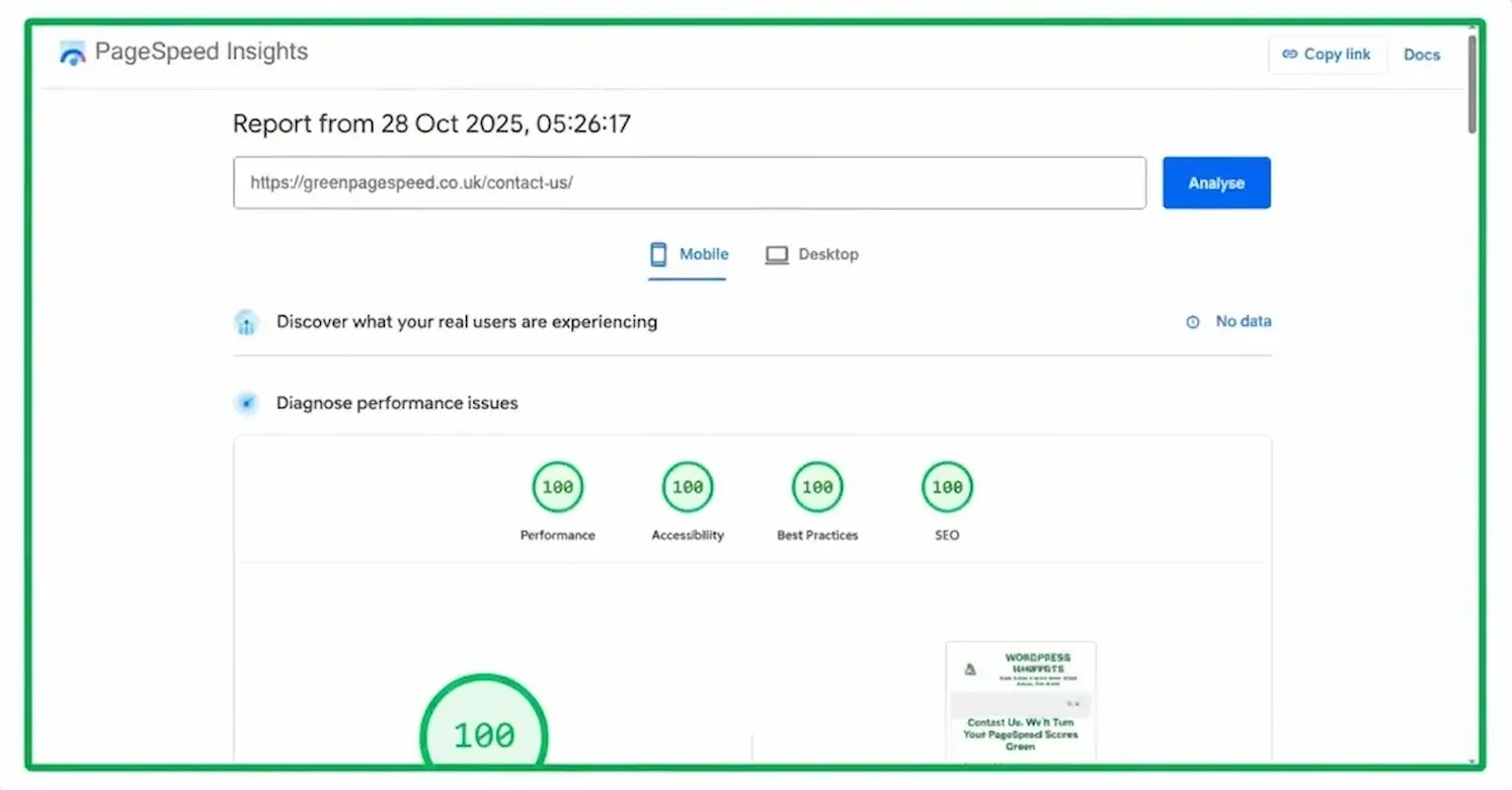 24/10/25 – Another flawless 100/100 mobile audit using PageSpeed Insights. Check your own score and see the difference.