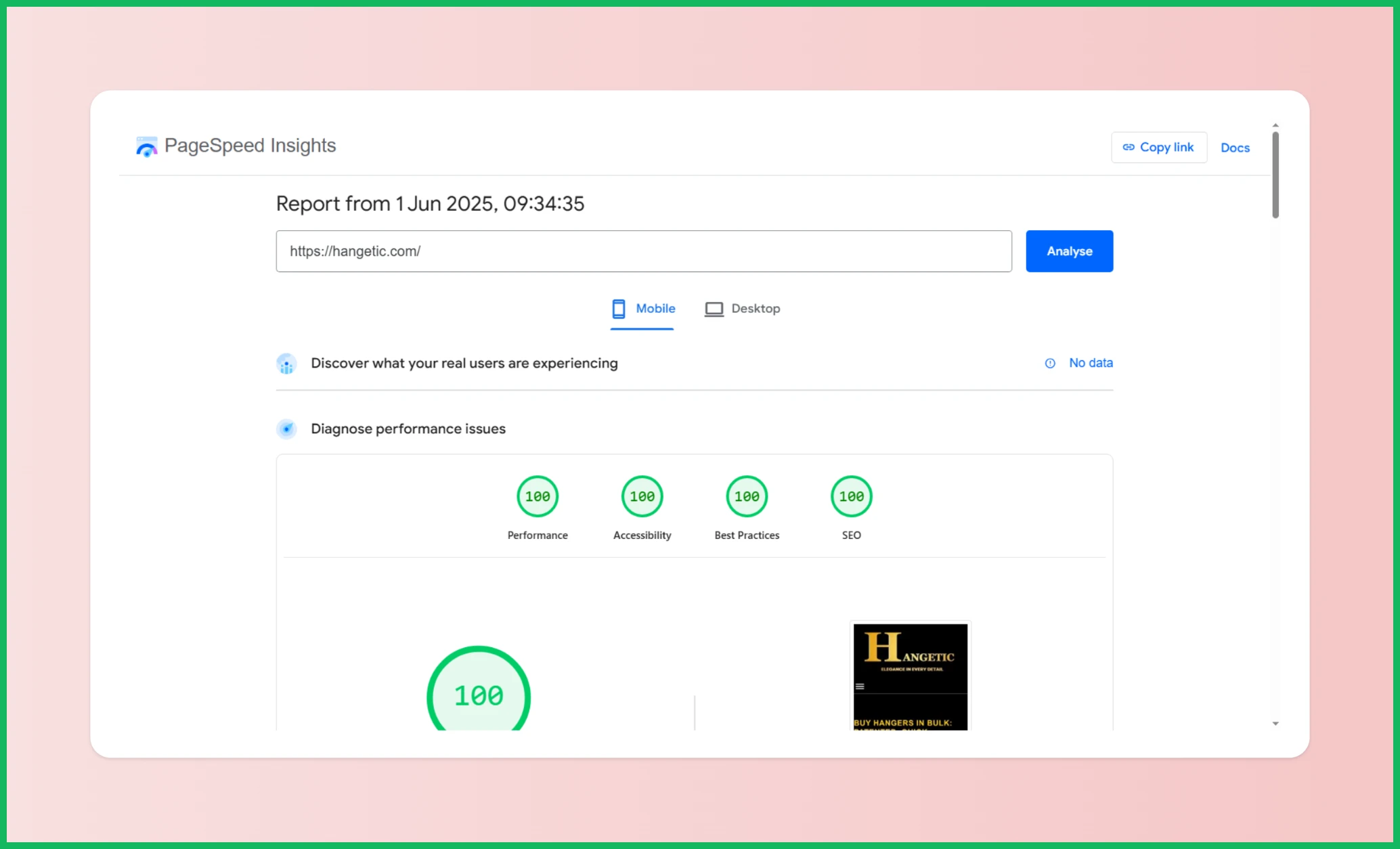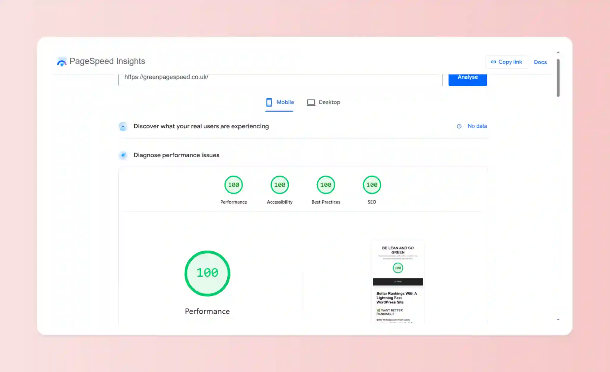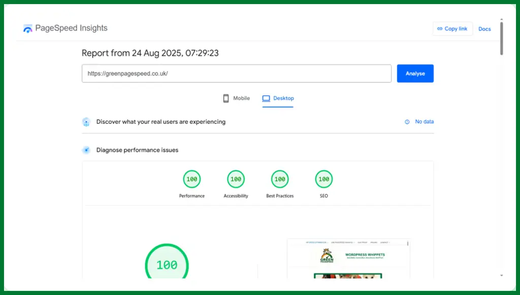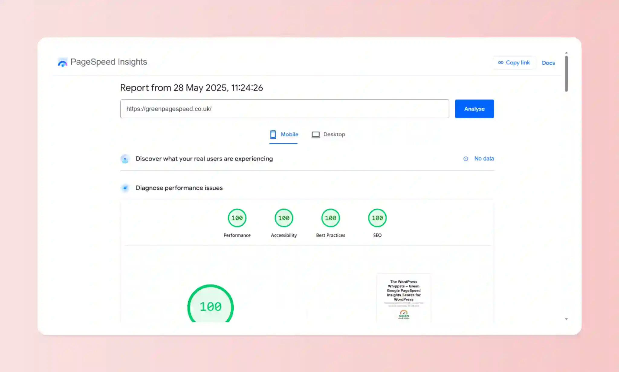 24/10/25 – Another flawless 100/100 mobile audit using PageSpeed Insights. Check your own score and see the difference.