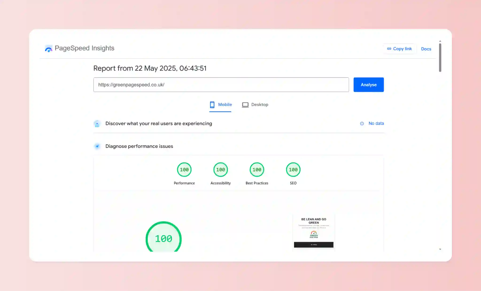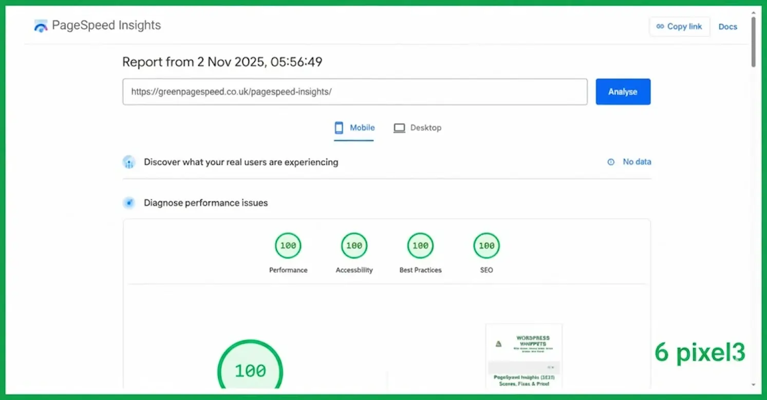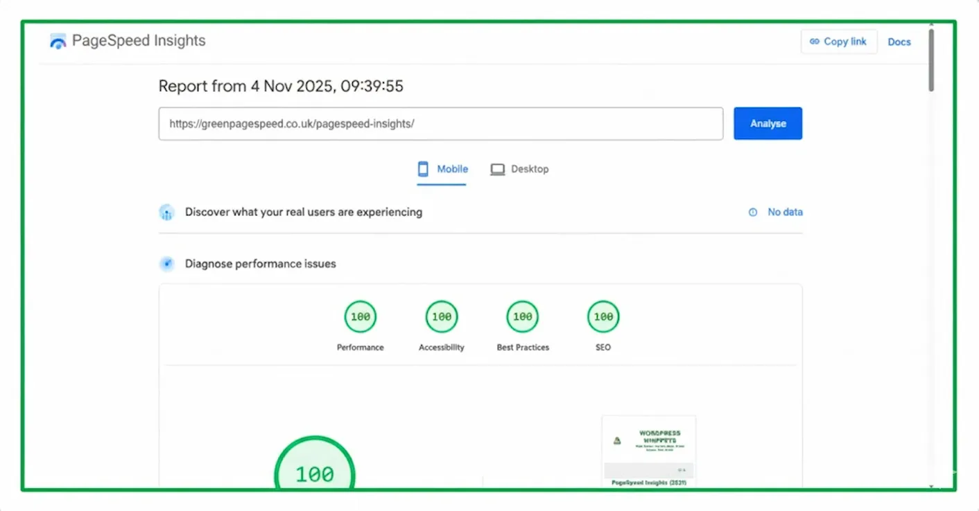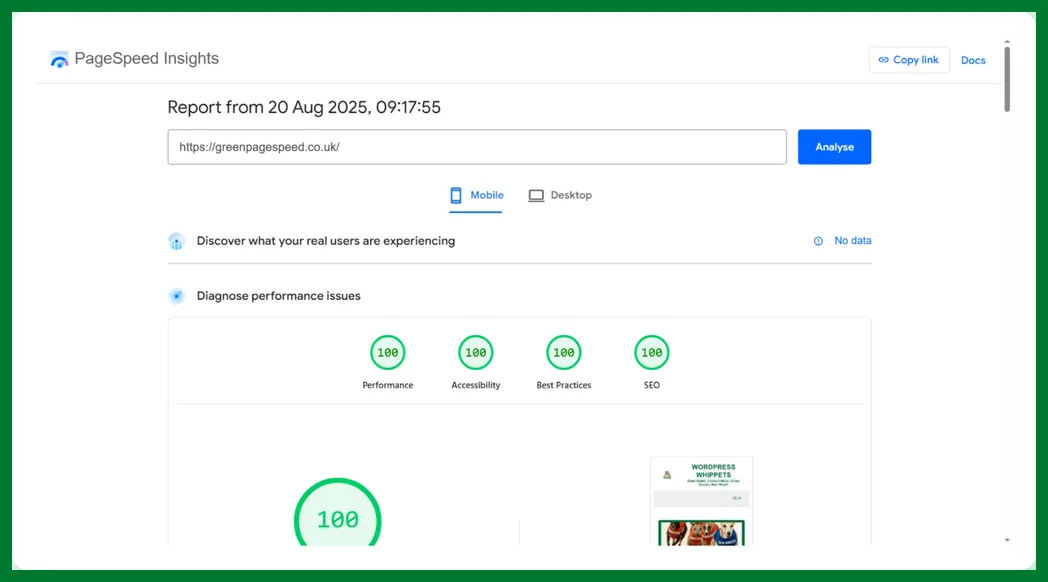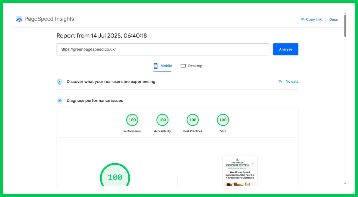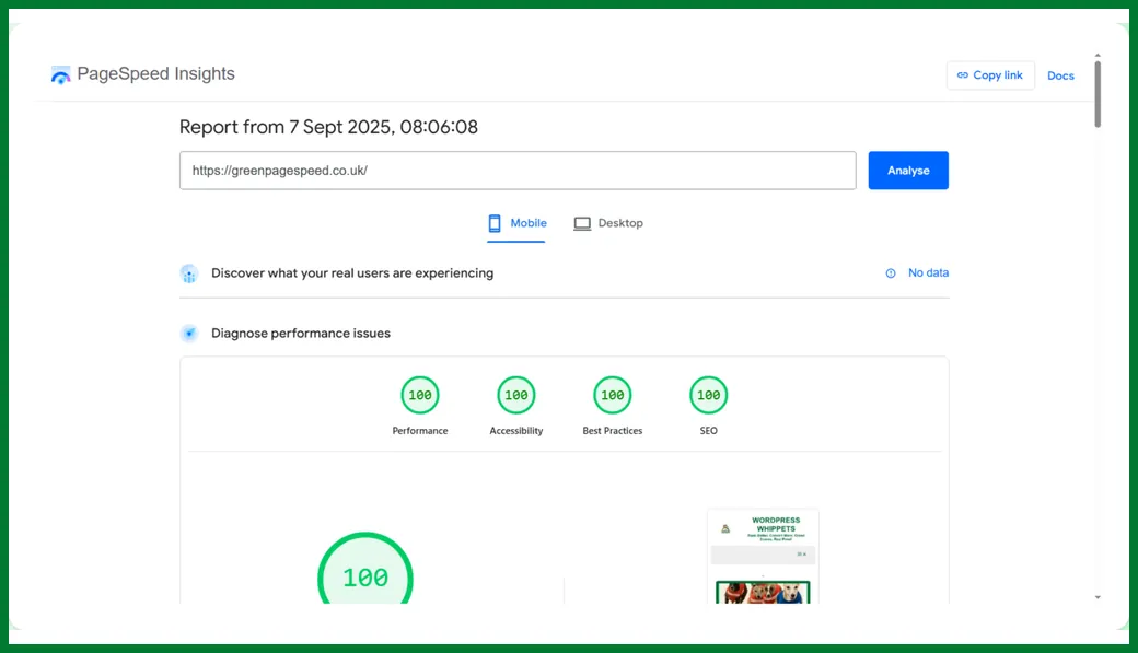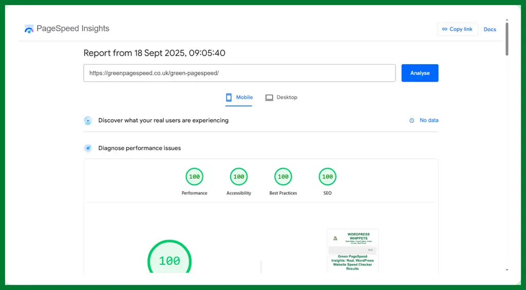 10/11/25 – Verified 100/100 PageSpeed Insights scores on mobile for Green PageSpeed, demonstrating consistent optimisation quality across the site.