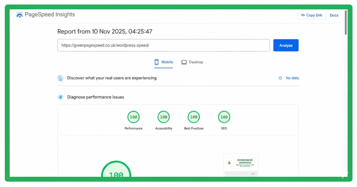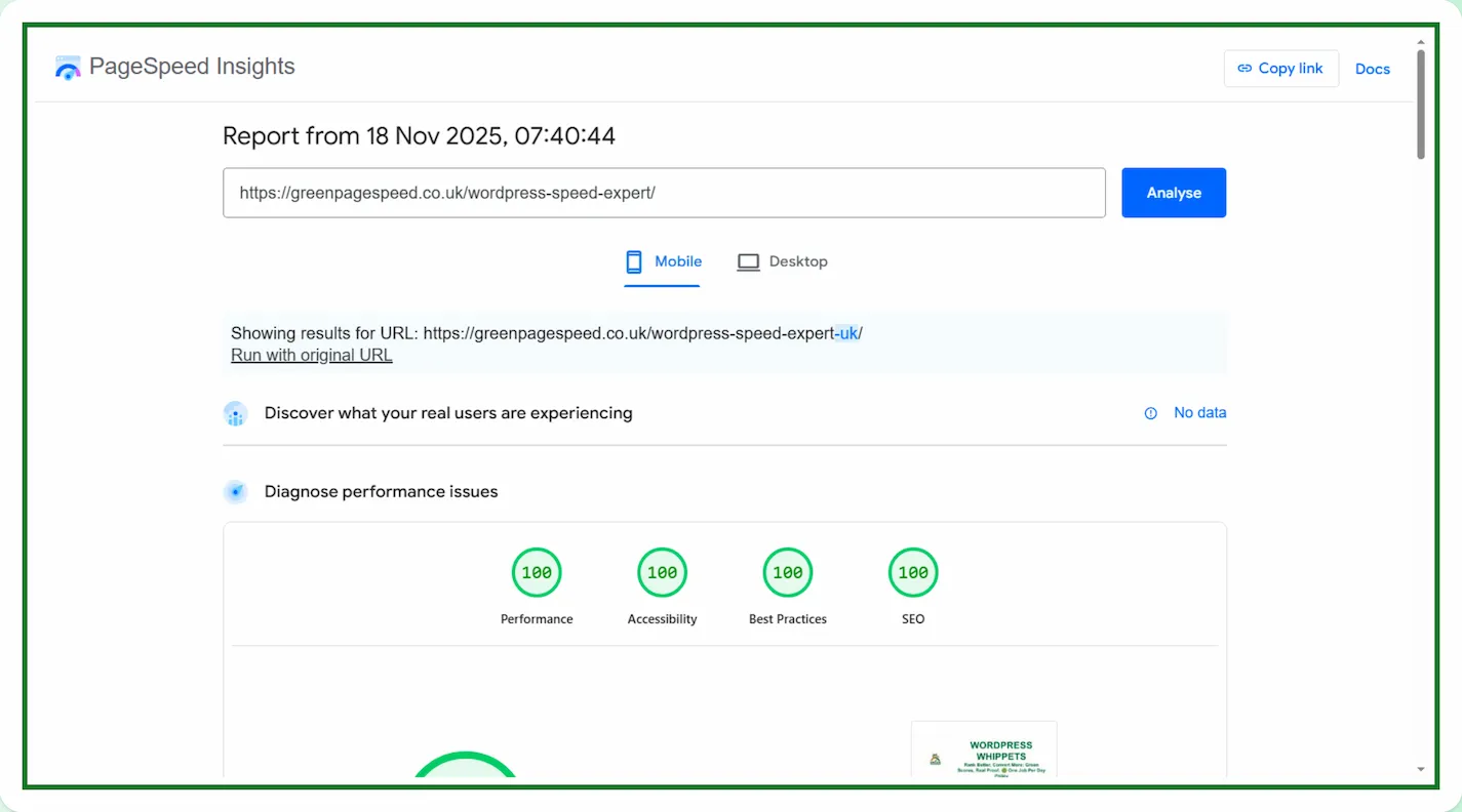 29/11/2025 β-WordPress Speed Expert UK hits full 100s on mobile