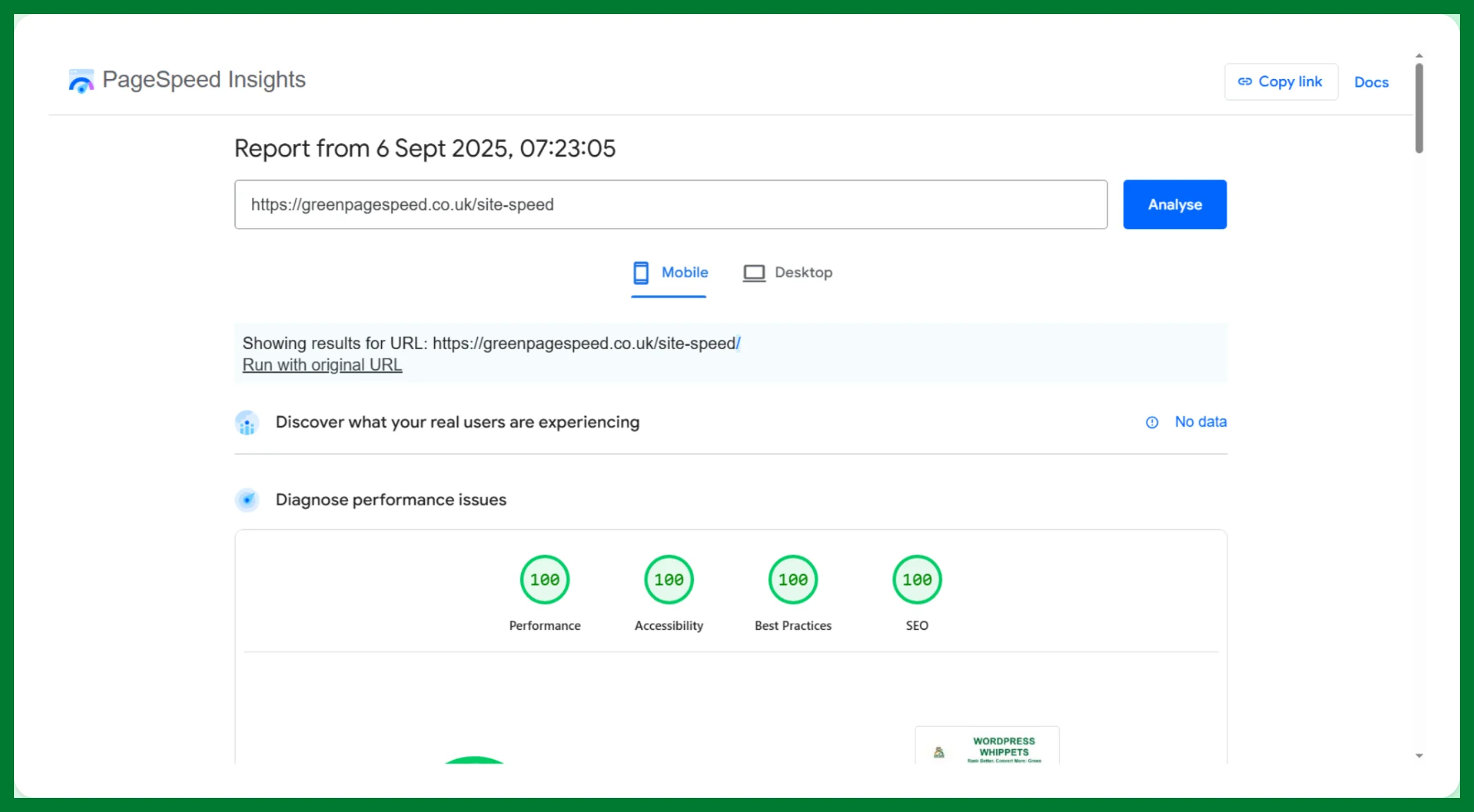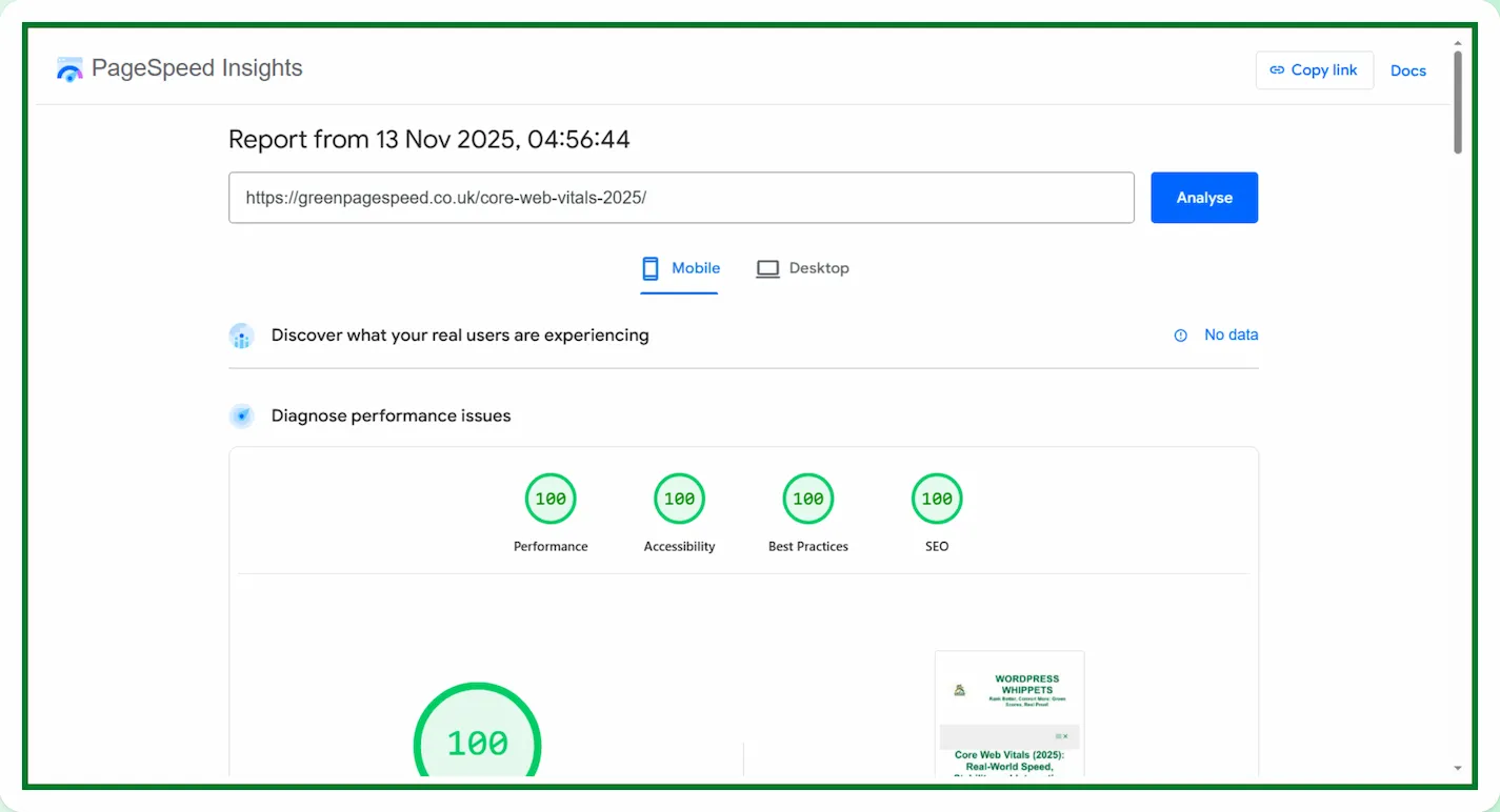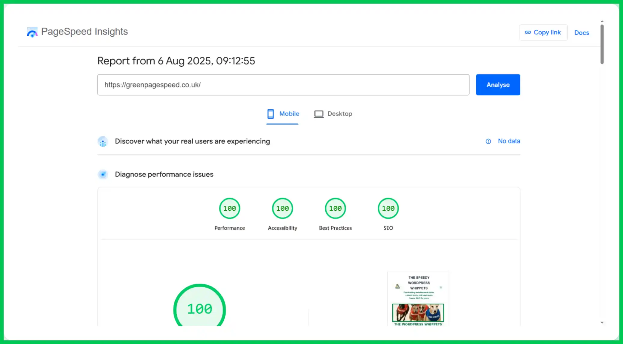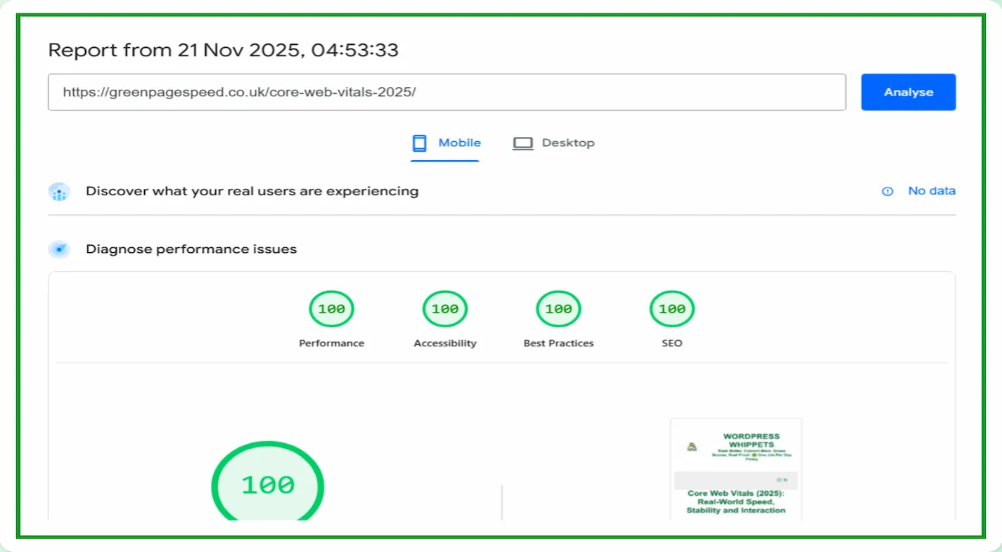 21/10/25 – 100/100 on mobile for Green Page Speed. A 1.1s load and 0 CLS show world-class optimisation.