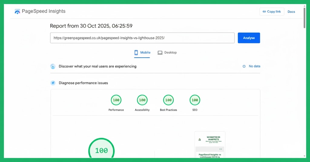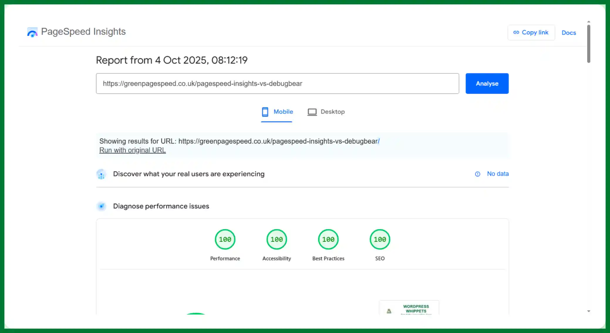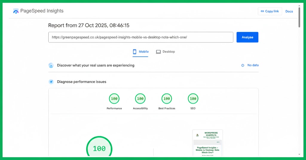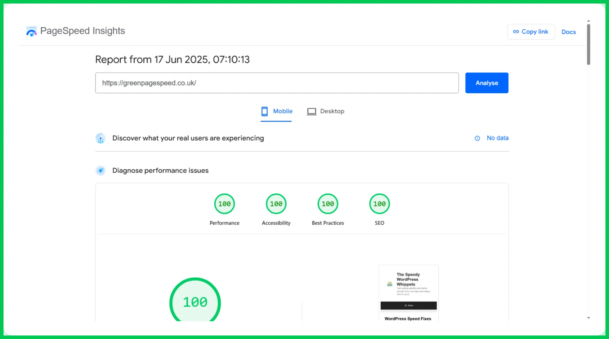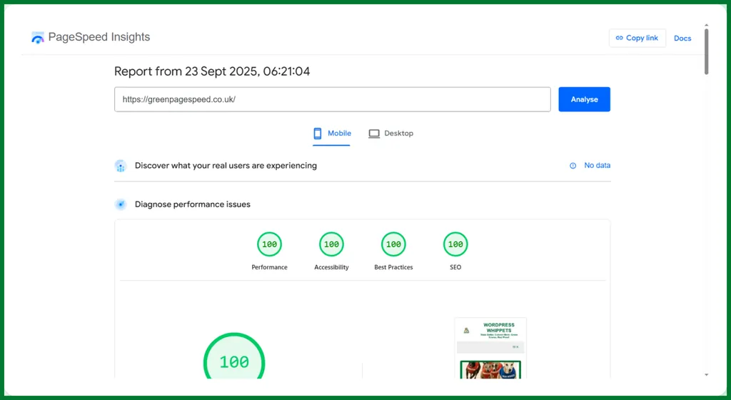 21/10/25 – 100/100 on mobile for Green Page Speed. A 1.1s load and 0 CLS show world-class optimisation.
