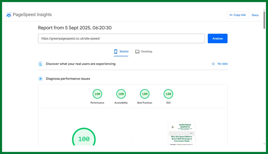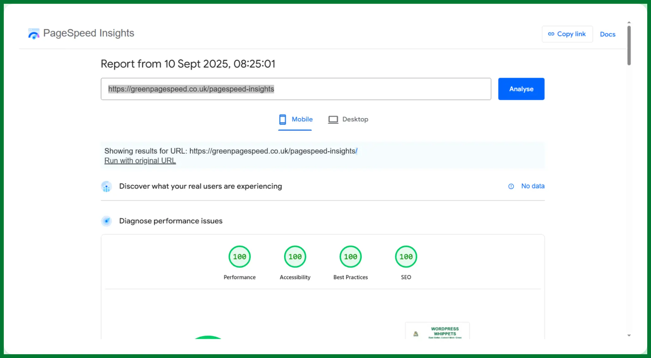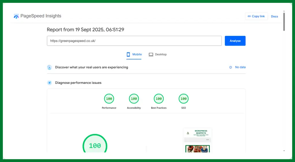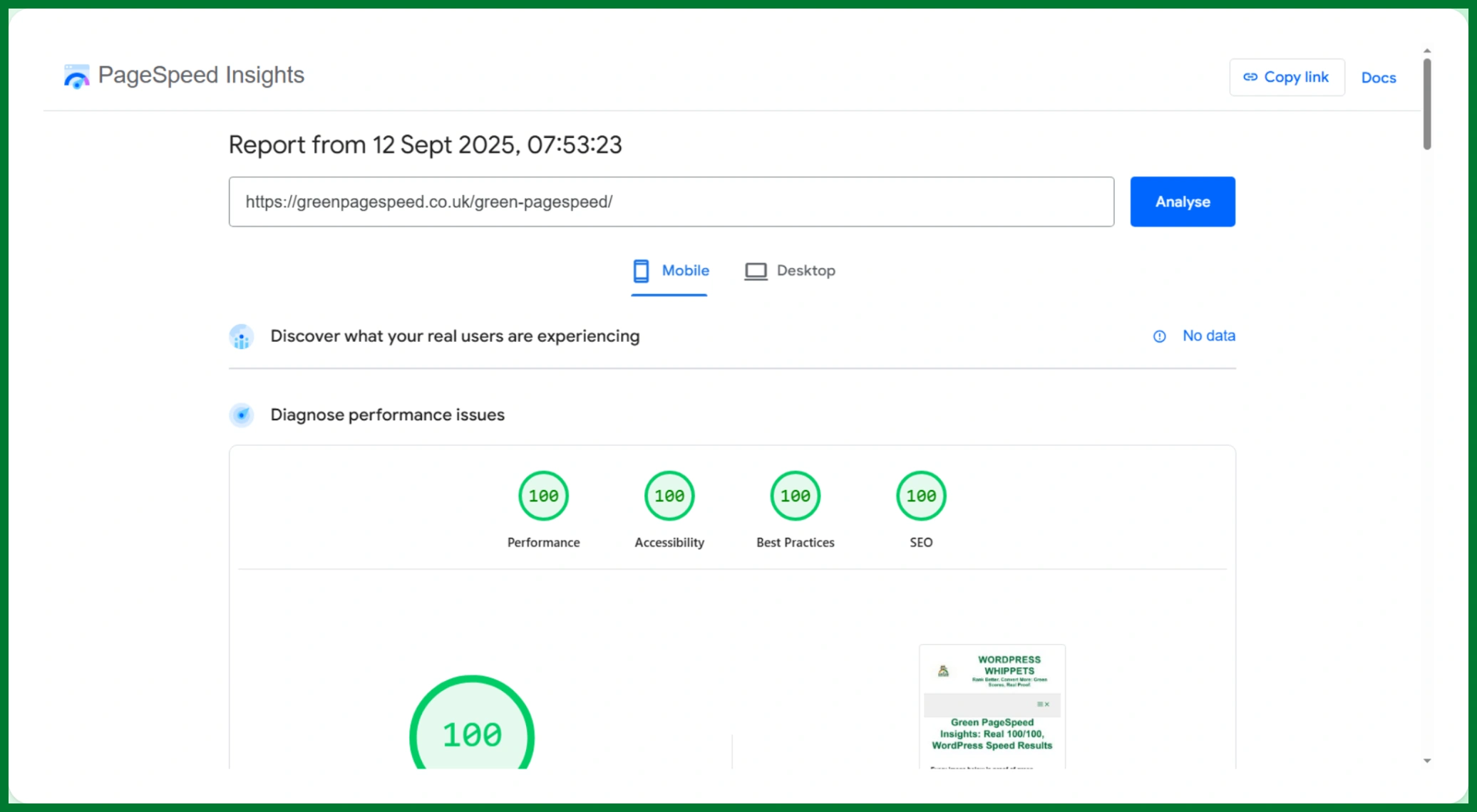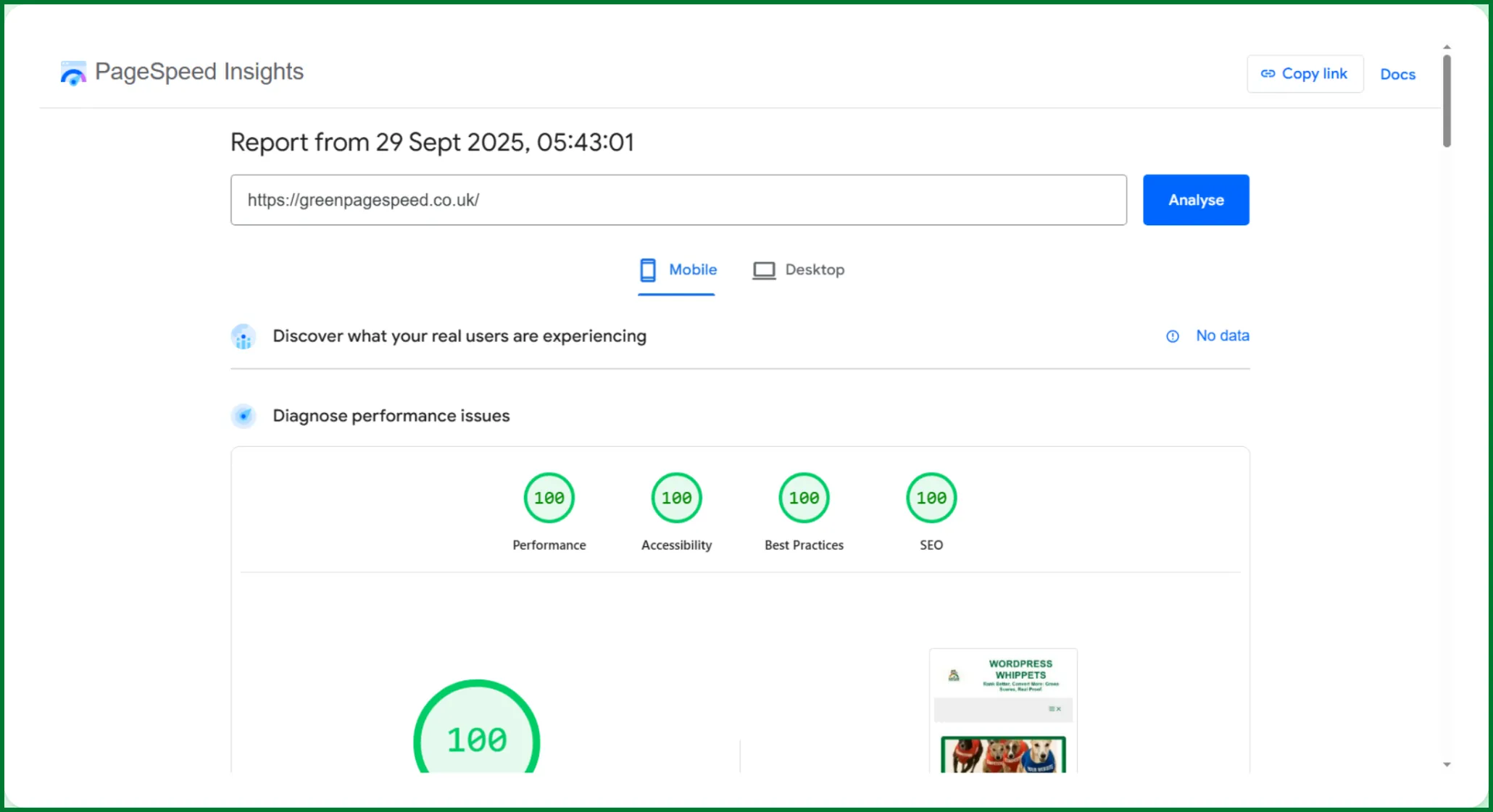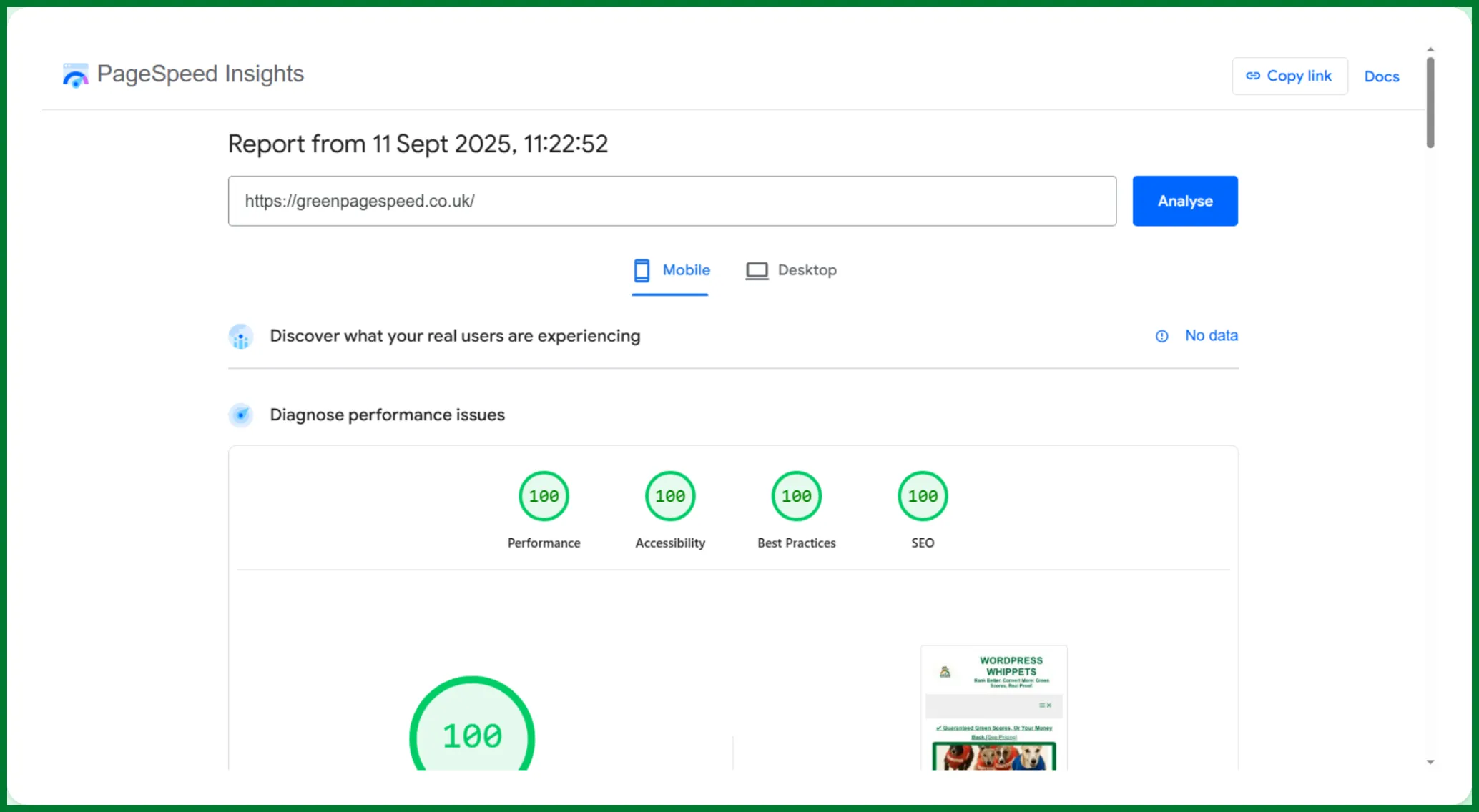 29/09/25 – 100/100 PageSpeed Insights mobile proof