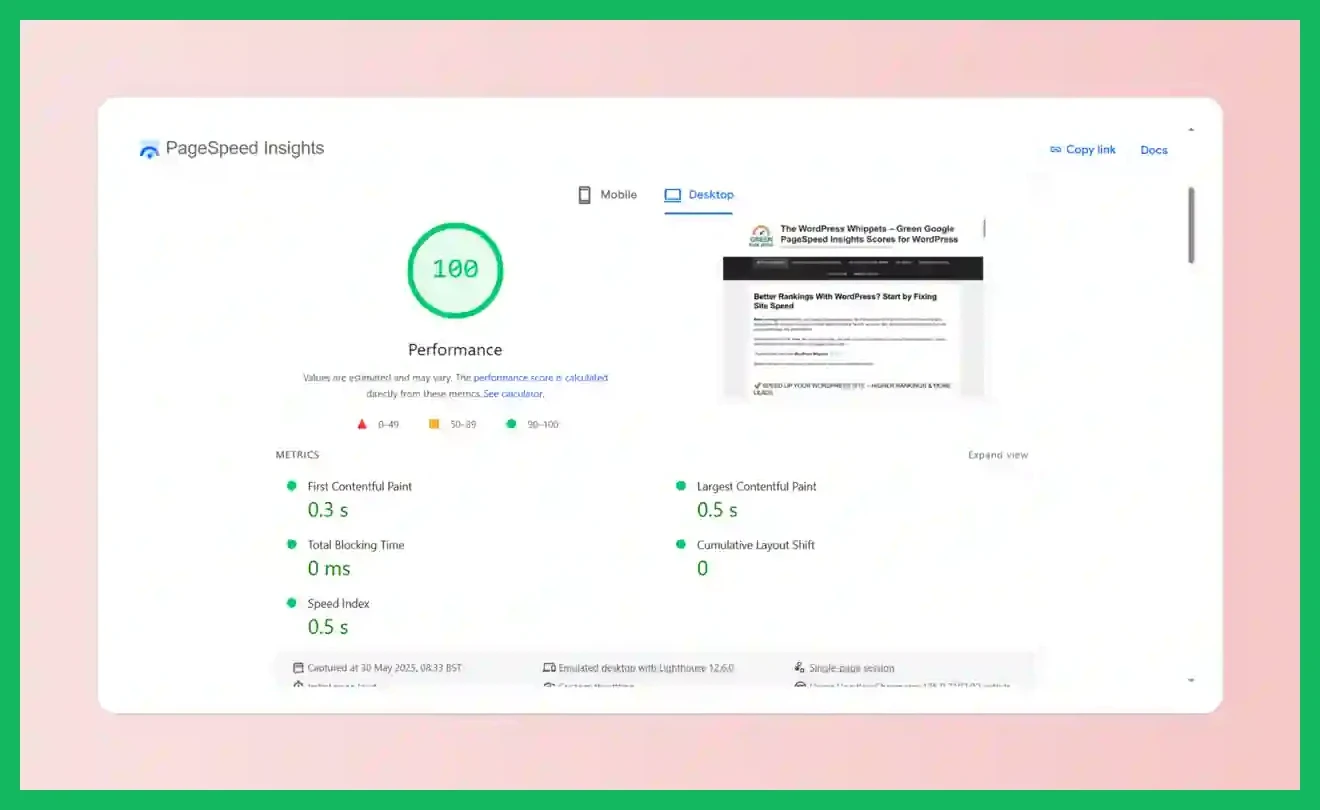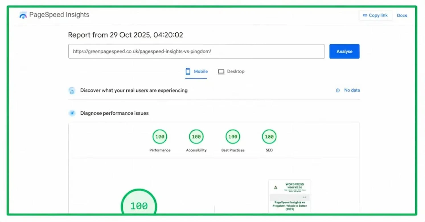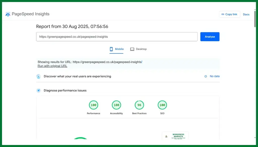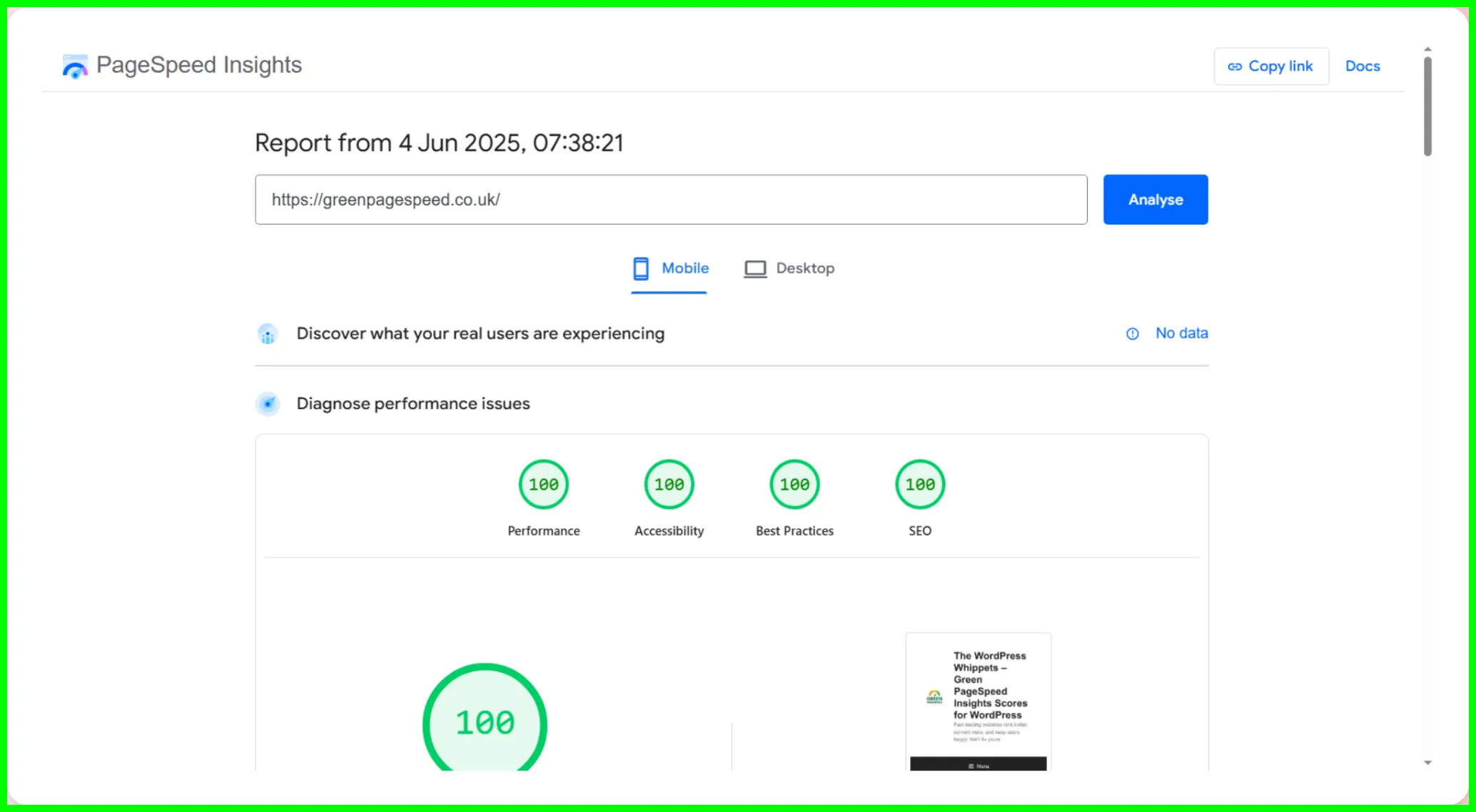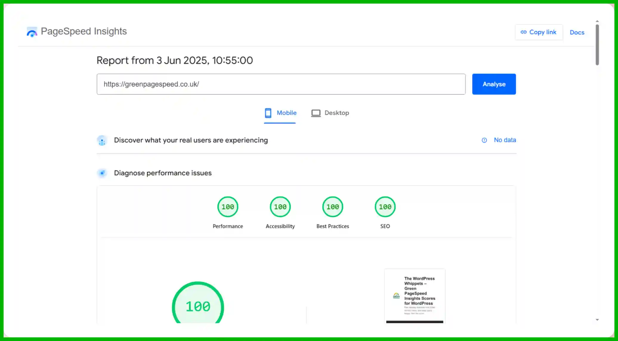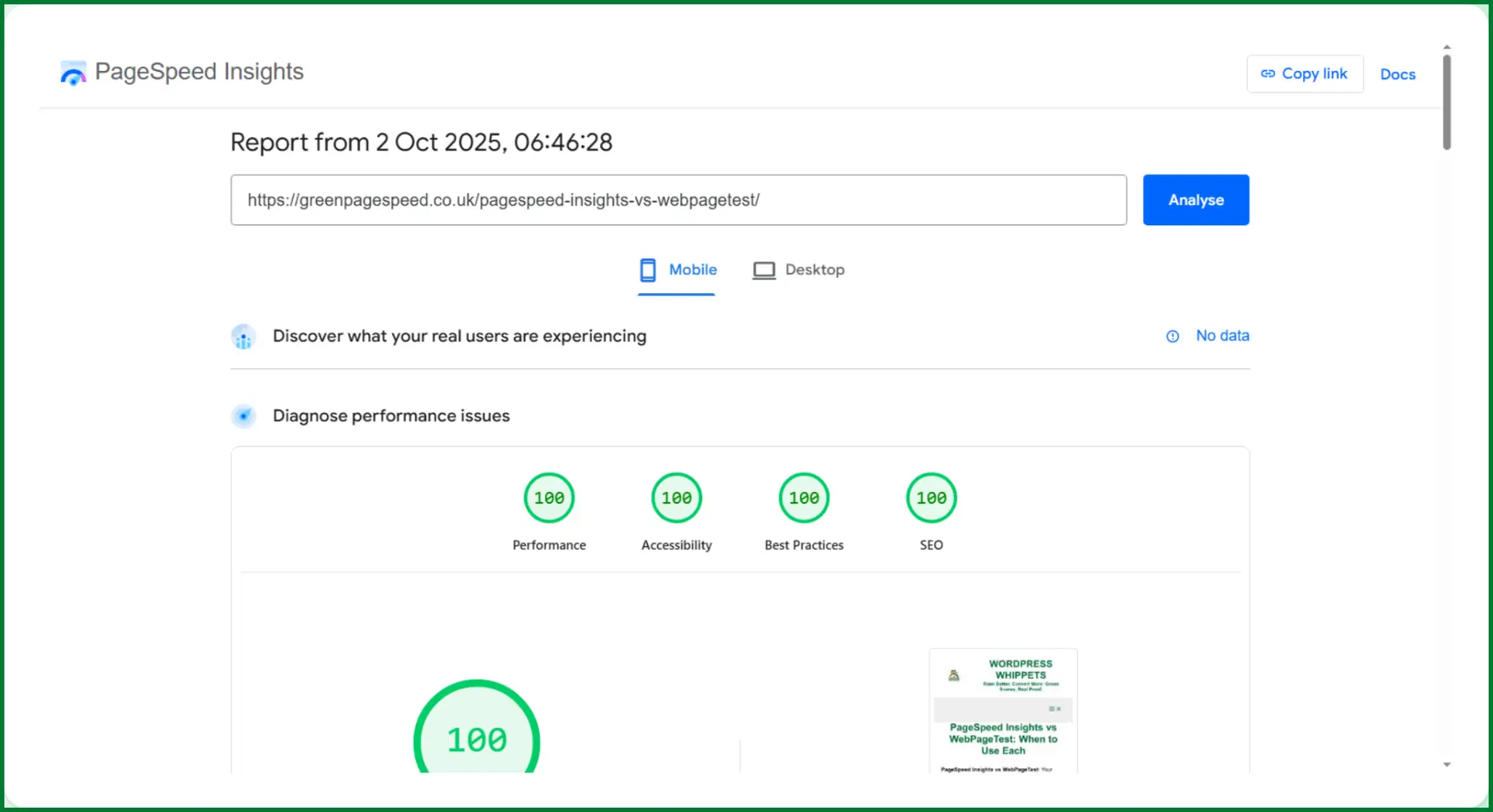 29/09/25 – 100/100 PageSpeed Insights mobile proof