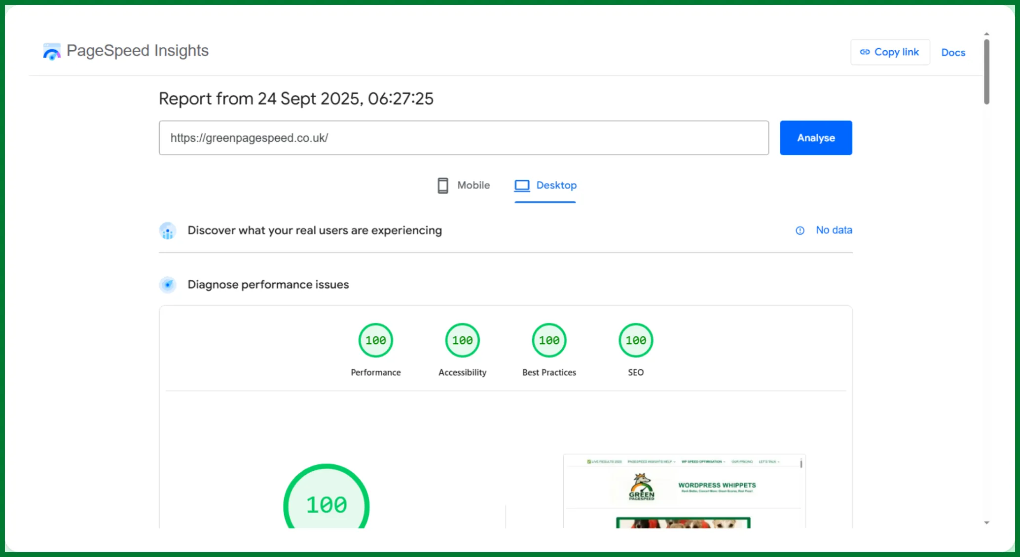 24/09/25 Green PageSpeed Insights desktop 100/100 proof