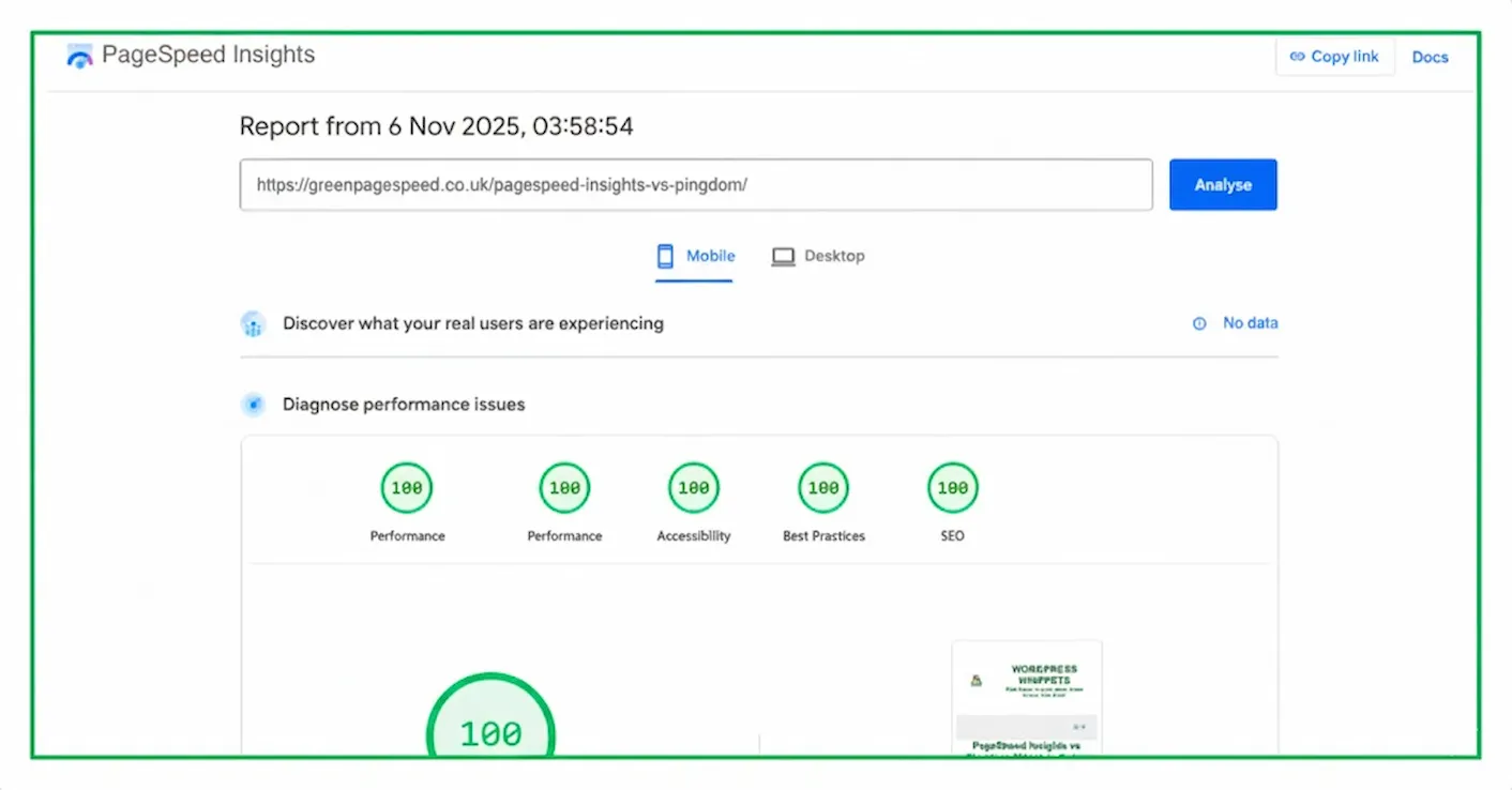 16/11/25 Mobile PageSpeed Insights test. Full 100 scores