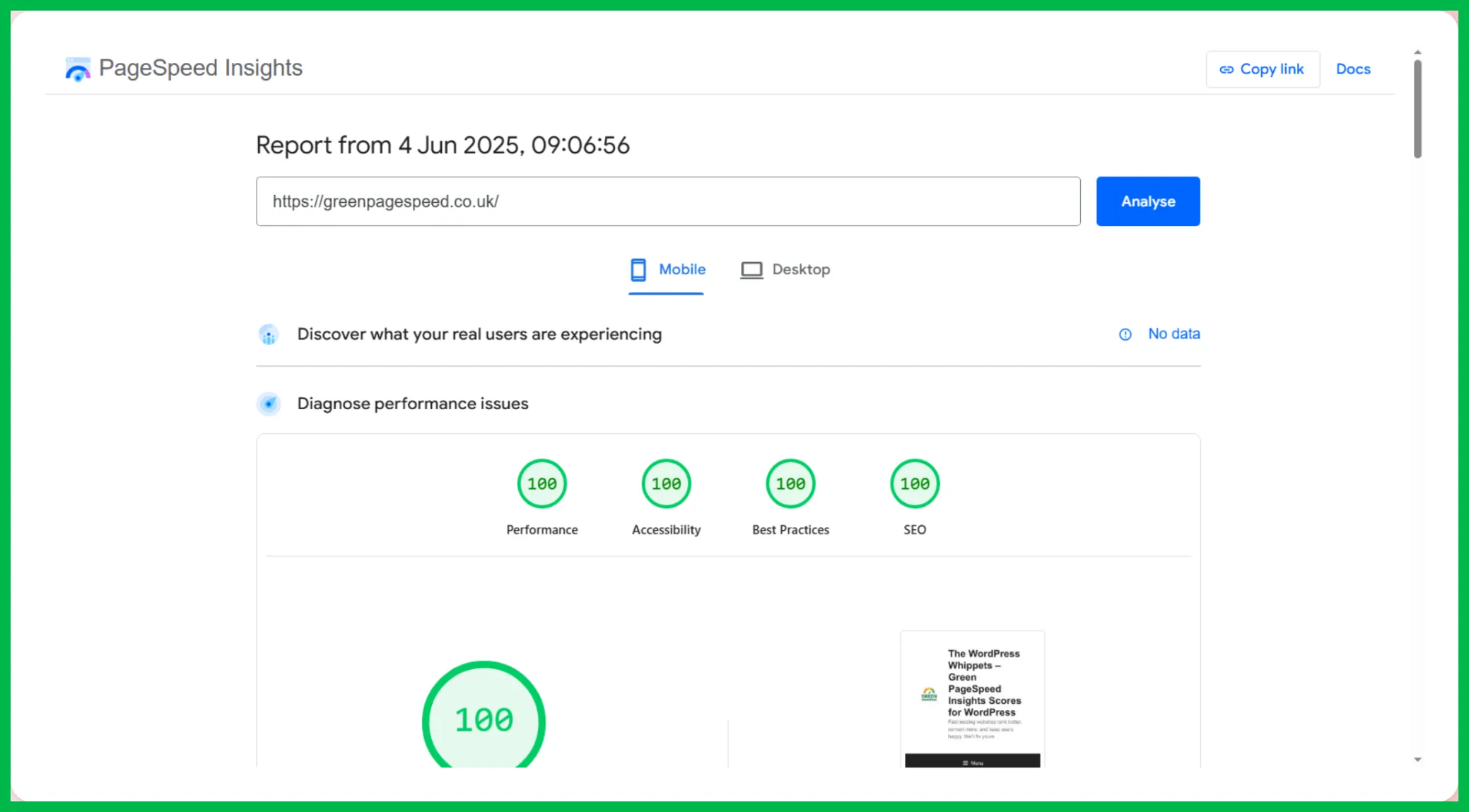 08/11/25 β Green Page Speed achieves full 100/100 results across all mobile categories for its WordPress Speed page.